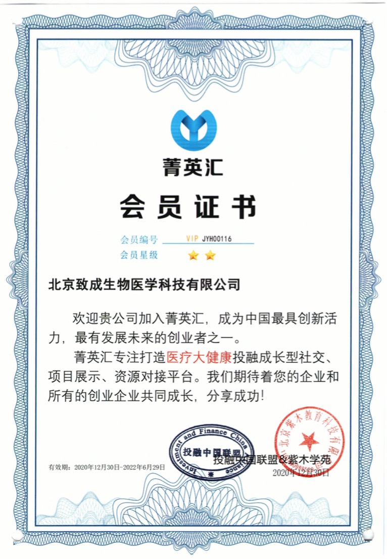 北京致成生物醫學科技有限公司成立于2014年4月,注冊資金500萬元,總部位于北京市經濟技術開發區亦莊生物醫藥園,是集“醫研權產銷”于一體的綜合性生物醫藥中關村高新技術、國家高新技術,中關村金種子企業等。公司現有全/兼職員工62人,其中碩士及以上學歷者57人。核心成員全部出自院士團隊,有著豐富的項目管理經驗、充足的科研經費以及優質的醫療市場資源。公司秉承“態度決定一切,細節決定成敗”的服務理念,輔助國內三甲醫院60余位客戶實施國家863項目、973項目、公益性行業科研專項項目以及國家重點、重大和國家自然基金項目等80余項,申請/授權國家ZL50余項,注冊商標60余件。